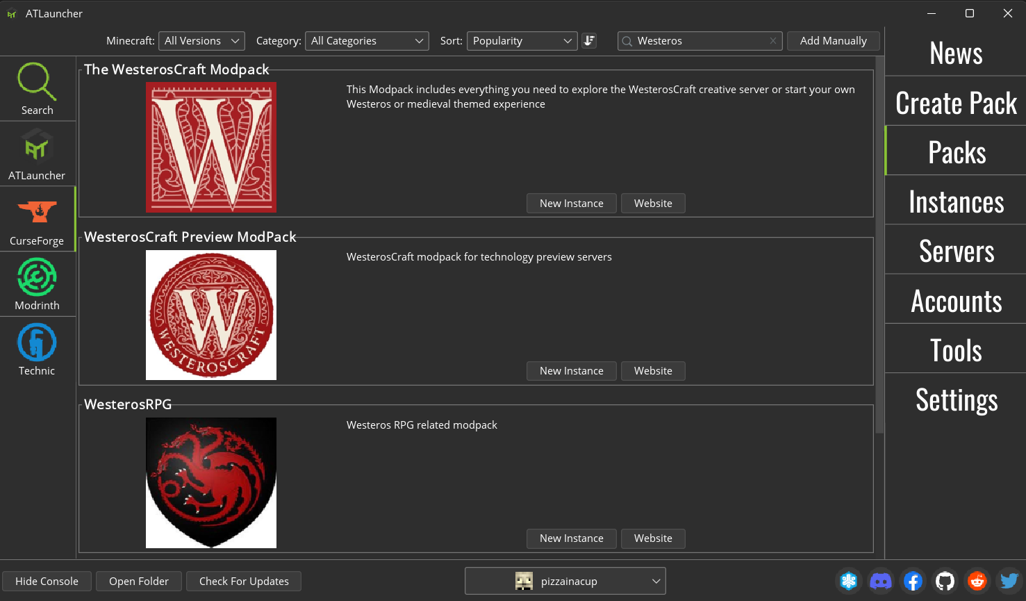 Next, select the "CurseForge" option on the left, and search for "Westeros" in the search bar. You are looking for "The WesterosCraft Modpack".