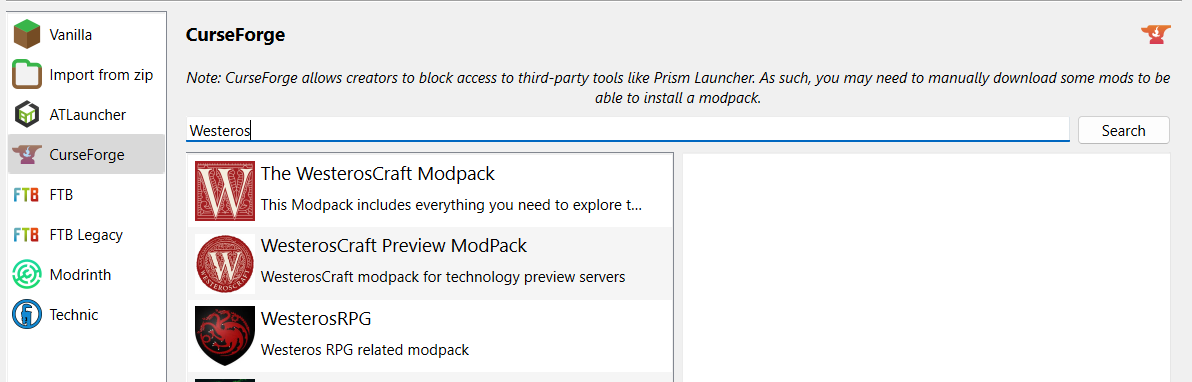 Next, select the "CurseForge" option on the left, and search for "Westeros" in the search bar. You are looking for "The WesterosCraft Modpack".