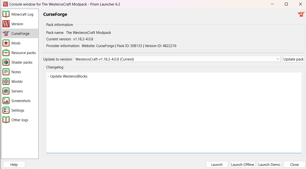 WesterosCraft updates the modpack on a semi-regular basis with new mods, bug fixes and additional blocks. When this happens, you need to update.